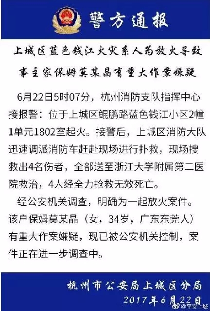 在官方宣布妈妈和三个孩子抢救无效死亡后,当地警方也做出回应:经公安调查,这是一起故意纵火案件。保姆今年34岁,来自广东东莞,有重大作案嫌疑,目前已被公安机关控制,案件正在进一步调查中。
