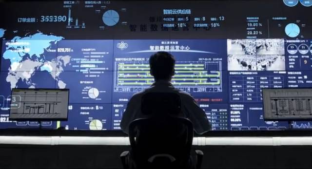 在邹魏三园二纺智能化紧密纺工厂偌大的车间里,只有寥寥数人,整个工厂生产情况在厂总控平台前一目了然。