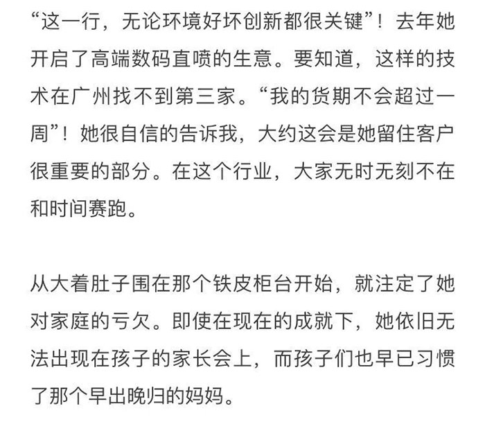 同样的,无论今日如何成功,一年大多数的时间里不是在工厂就是在仓库。97年在纺织城的那个小柜台,也是肖丽明掘金开始的地方。"当时一个月都没开单,快要熬不住了"!那个时候突然出现的一个越南客户,一次拿走了几十万的货,算是救了她生意一命。"大约注定就是要做这个吧,一进来就出不去了!"