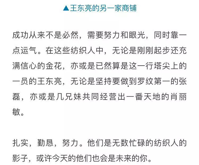 跟张磊很像,王东亮也希望自己一辈子做好一件事,对于他来说这件事就是布料。在别人看来最不易有变化不易改良的类型,在王总手里玩儿出了花,现在说起中大市场,大约已经没有人不知道他家的条纹布料。