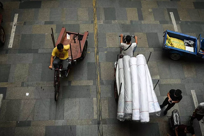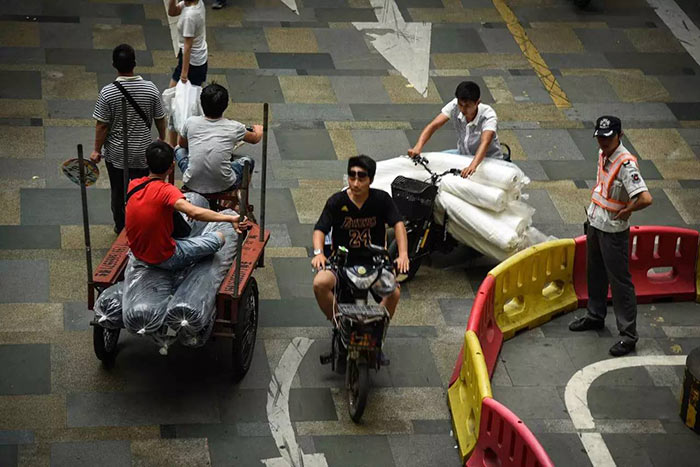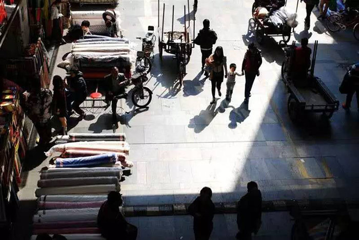 就像中大市场,如今繁忙依旧。机动运输车穿梭在轻纺城里,小街道里。早上大约9点,店铺都开了门。伙计们清点着前一天的清单,老板们打着电话跟客户套近乎。大约在中午时分,整条街道开始繁忙起来,这程度甚至牵连了周边几公里外的主干道。
