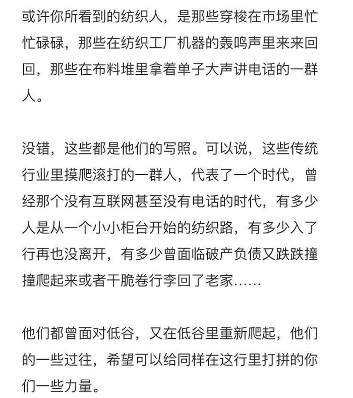 有人说五年内大约纺织行业会死掉一半。至少从他们的脸上,我没看到沮丧。不断创新、把握质量、做好服务是他们的共通点,希望他们的曾有过的经历,能够给同样在纺织行业摸爬滚打中的你们一些前进的力量。