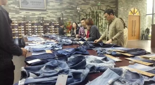 服装厂商设计师到致兴纺织展厅选购牛仔面料。 盛正挺摄