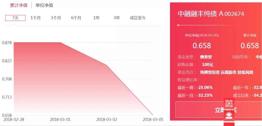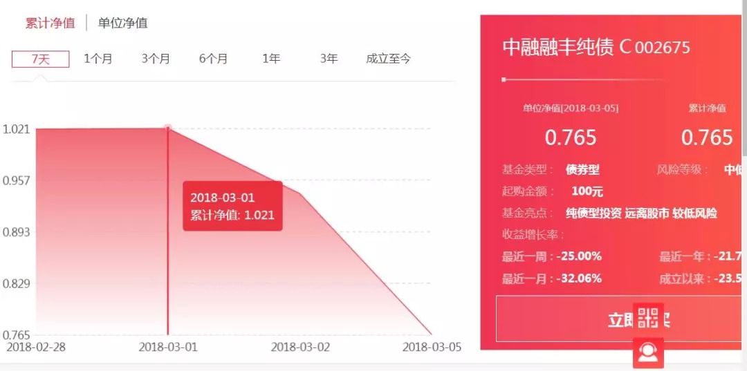 自14富贵鸟3月1日复牌大跌后,中融融丰纯债A单位净值已经由0.878跳水到3月5日的0.658,中融融丰纯债C单位净值也由1.021降到0.765。