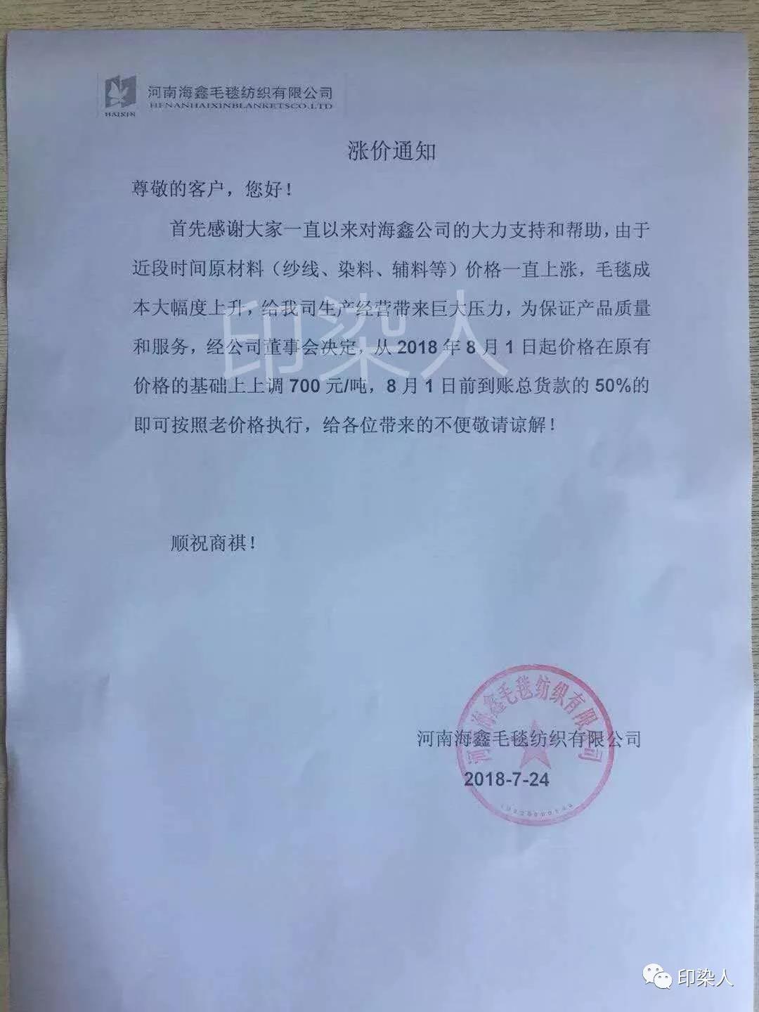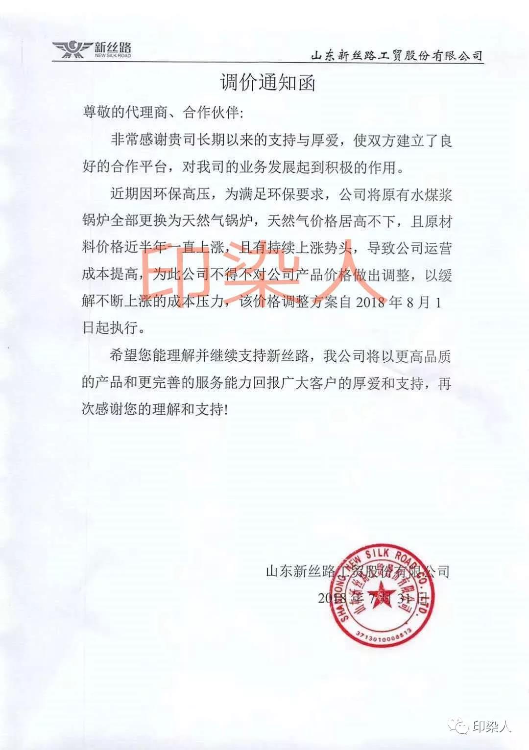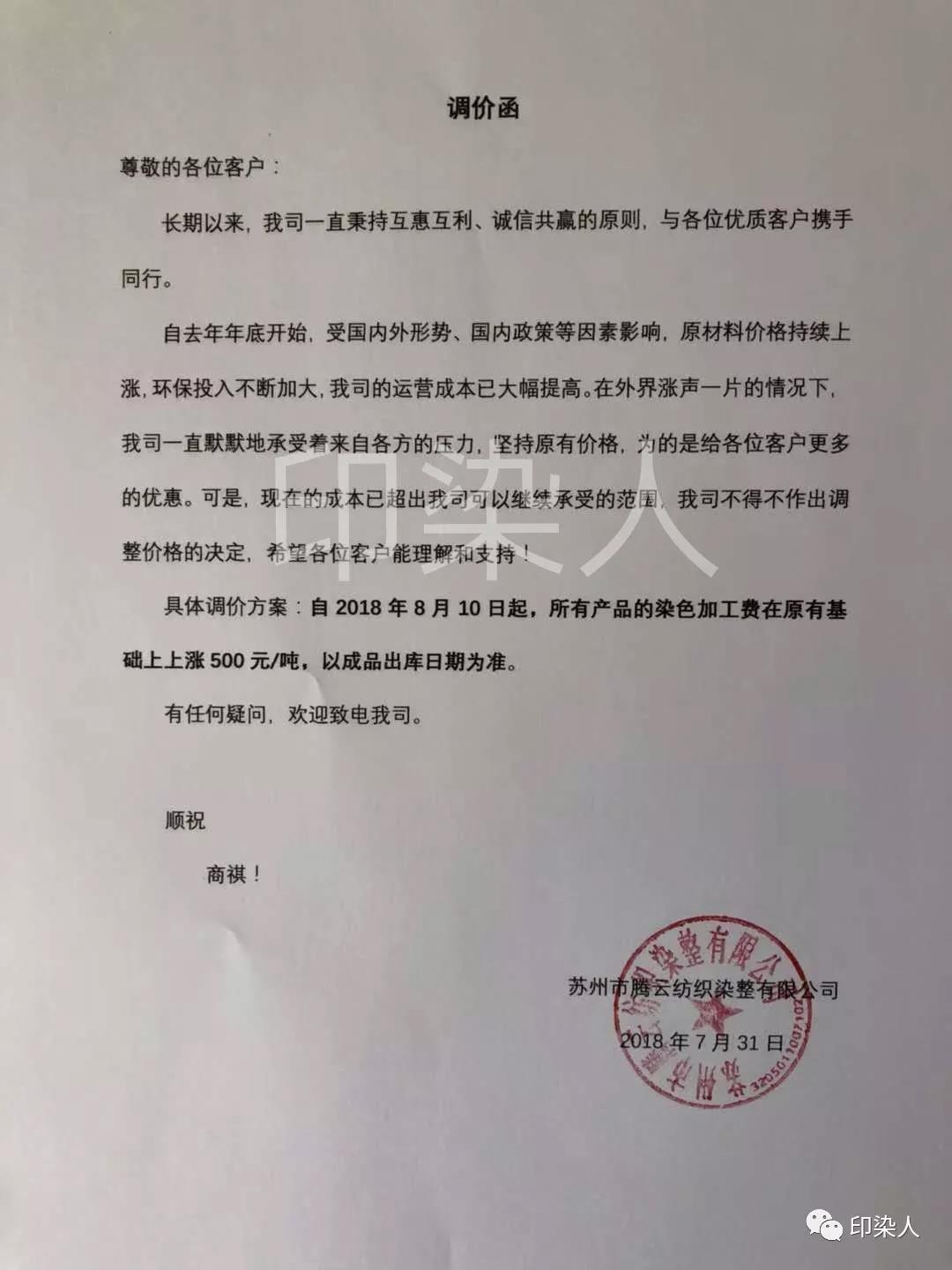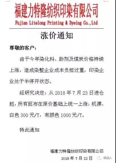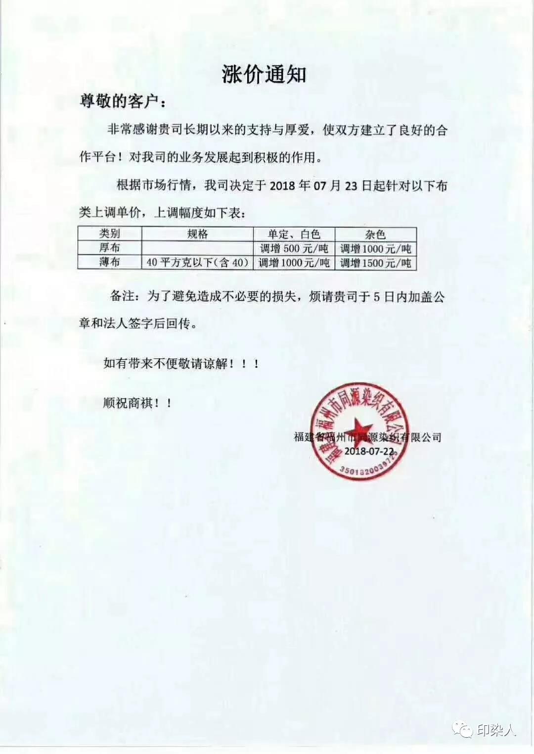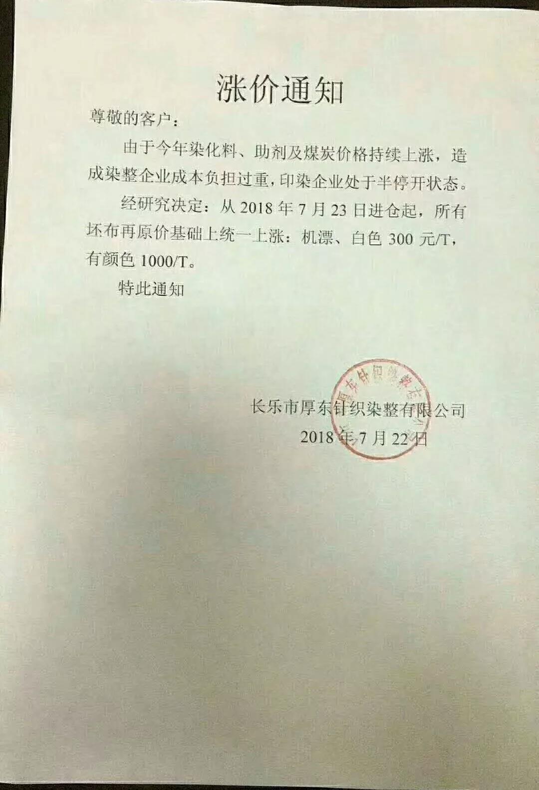 继广东汕头,普宁,佛山,江苏南通,常熟,常州,江阴一带,浙江绍兴,金华地区,福建石狮,长乐一带,江苏苏州今年以来少见的染费上调通知,终于在成本不断提升的情况下,不得为之调整染费。