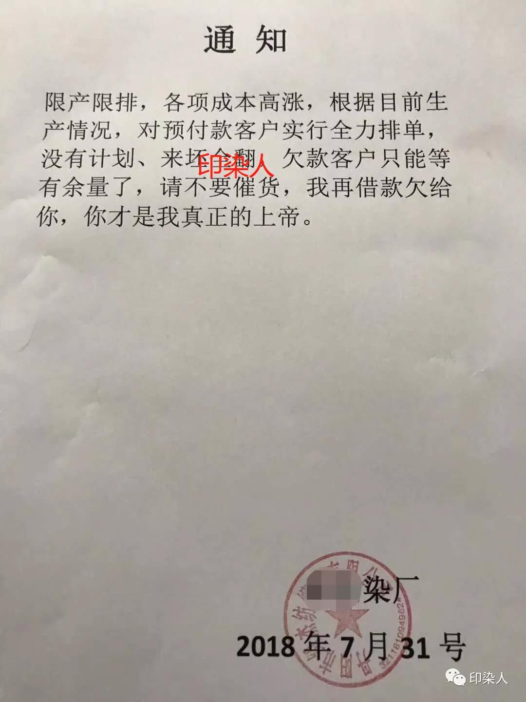 染老板说:“限产限排,各项成本高涨,根据目前生产情况,对预付款客户进行全力排单,没有计划,来坯全翻,欠款客户只能等有余量,请不要催货,我再借款欠给你,你才是我真正的上帝。”