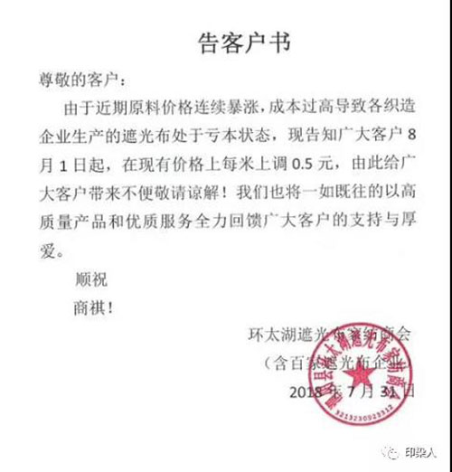 环太湖遮光布家纺商会发出通知:8月1日起,各织造企业所生产的遮光布价格上调0.5元/米!