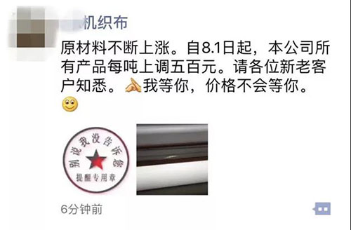“这段时间原料涨得太厉害,我们也将报价上调,坯布涨0.10元/米,成品涨0.20元/米。”盛泽专做防寒服里面料的崔总说道。近阶段原料价格不断上涨,个别品种涨价超千元,这也导致不少的坯布厂家不堪成本重负,纷纷发出涨价通知。