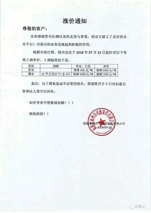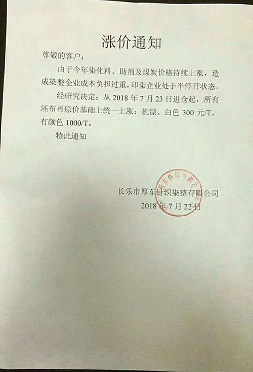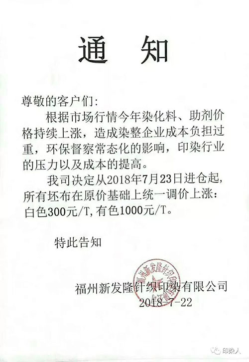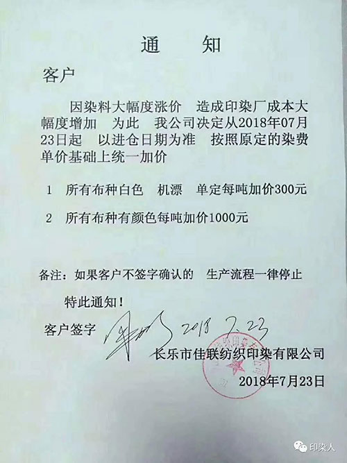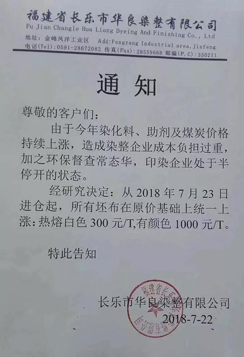 继广东汕头,普宁,佛山,江苏南通,常熟,常州,江阴一带,浙江绍兴,金华地区,福建石狮,长乐一带,江苏苏州今年以来少见的染费上调通知,终于在成本不断提升的情况下,不得为之调整染费。