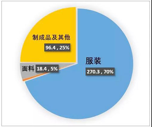 根据美国OTEXA数据统计,2017年中国纺织品服装对美出口总额为387.4亿美元。其中,出口服装270.3亿美元,出口纺织及制成品117.1亿美元(包括纱线2.2亿美元,面料18.4亿美元,家用纺织品、产业用纺织品及其他制成品96.4亿美元)。