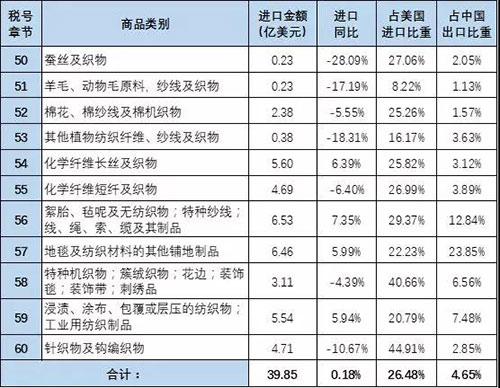 按照ITC口径,我们整理了涉及加税的HS50-60章对美2017年出口金额如下: