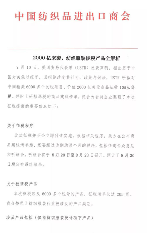 前天还在预测美国下一波征税对象将波及纺织服装业,结果昨天特朗普的大棒就抡过来了——7月10日,美国贸易代表署(USTR)发表声明,指出基于中国对美施以报复,且拒绝改变其行为、政策与做法,USTR研拟对中国输美6000多个关税项目、价值2000亿美元商品征收10%从价税,并附上研拟课税的商品建议清单,商品类目包括纱线、羊毛、雨衣、夹克、外套等。