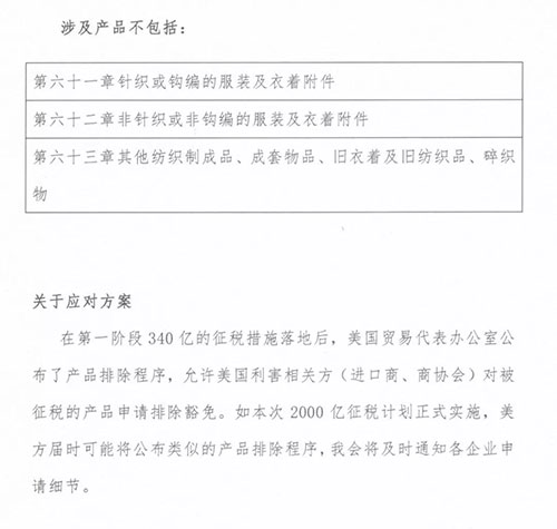 3、此次清单不包括服装类产品和大部分家用纺织品