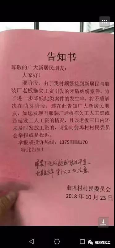 突发的跑路让工友防不胜防,服装微加工用户晒出附近村委会的告知书。