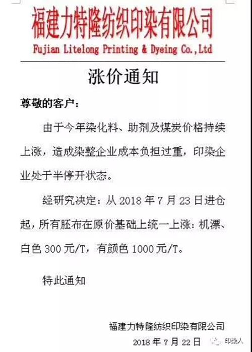 继广东汕头,普宁,佛山,江苏南通,常熟,常州,江阴一带,浙江绍兴,金华地区,福建石狮,长乐一带,江苏苏州今年以来少见的染费上调通知,终于在成本不断提升的情况下,不得为之调整染费。