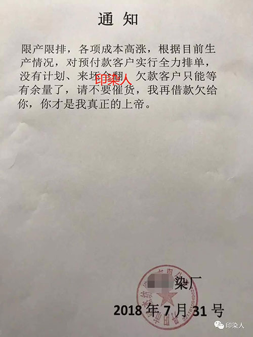 染老板说:“限产限排,各项成本高涨,根据目前生产情况,对预付款客户进行全力排单,没有计划,来坯全翻,欠款客户只能等有余量,请不要催货,我再借款欠给你,你才是我真正的上帝。”