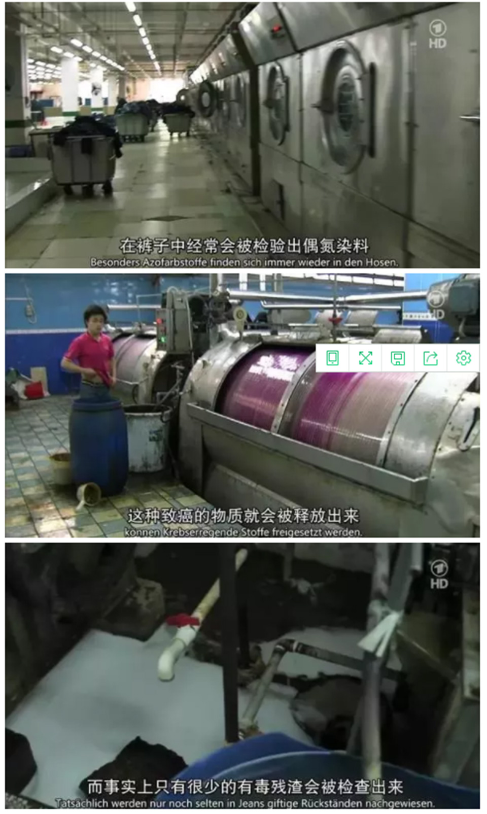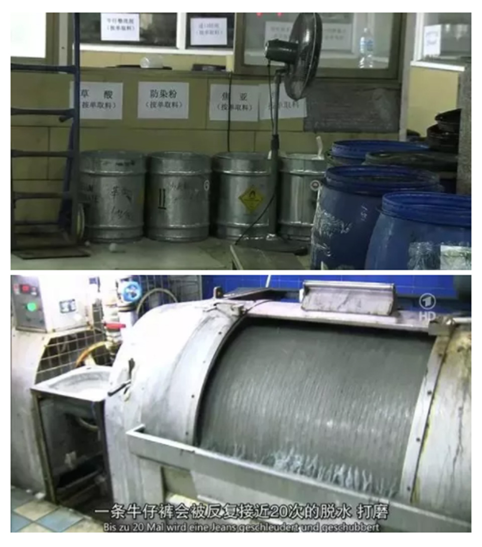 为了达到出口时的质量检测标准,牛仔裤的生厂商会通过反复的洗涤以使远在欧美的顾客察觉不到化学品的存在,一条牛仔裤出厂前要经过反复20次脱水打磨,然后磨破、漂白、重新上色。为了洗的尽可能干净,水里会添加大量的表面活性剂。之后这些污水基本上不经过任何处理,就直接排入了水沟,最终汇入珠江。