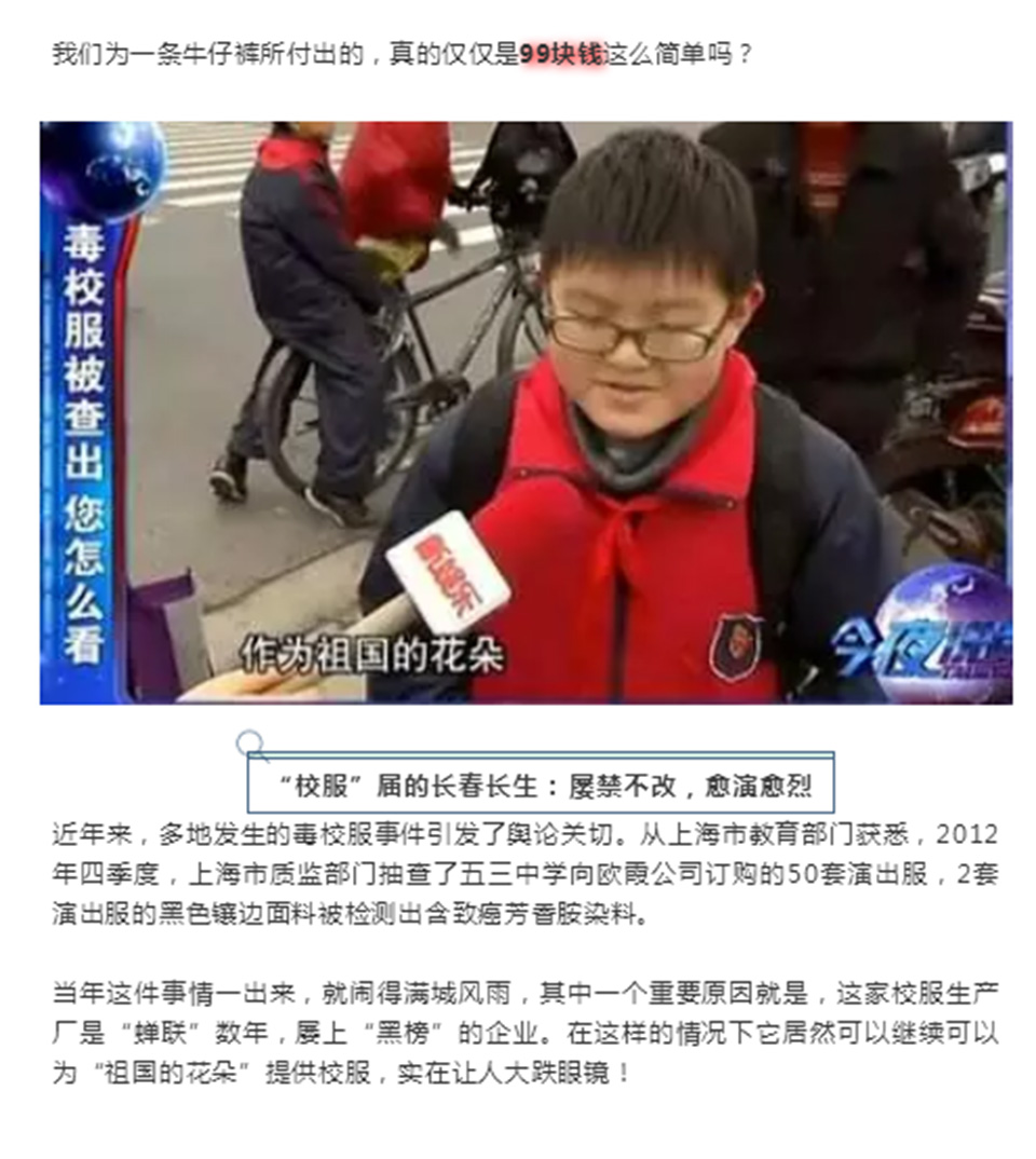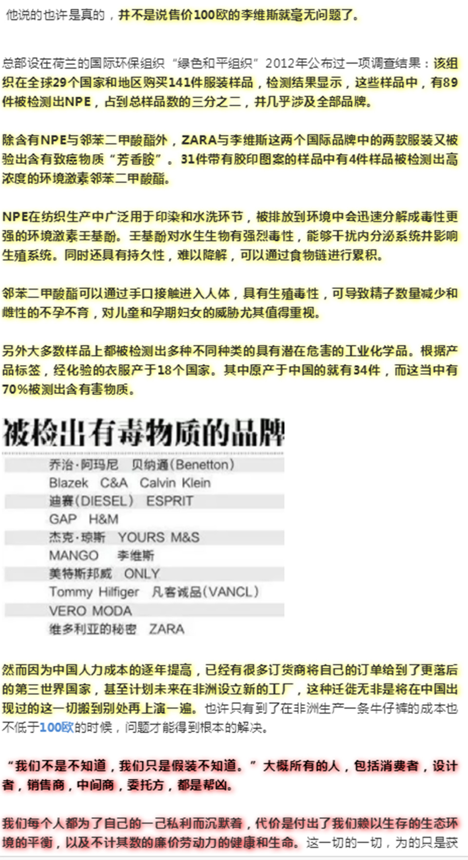 然而这样的洗涤不过是走走过场,让牛仔裤“闻”起来不是那么刺鼻而已,实际上对人类的伤害并没有显著的减少,在皮肤出汗的时候,这些隐藏在牛仔布料中的有毒致癌物质便会被释放出来,和你的肌肤直接接触。浪费和污染了那么多水之后,达到的不过是个自欺欺人的效果,我真不知道是该哭还是该笑。
