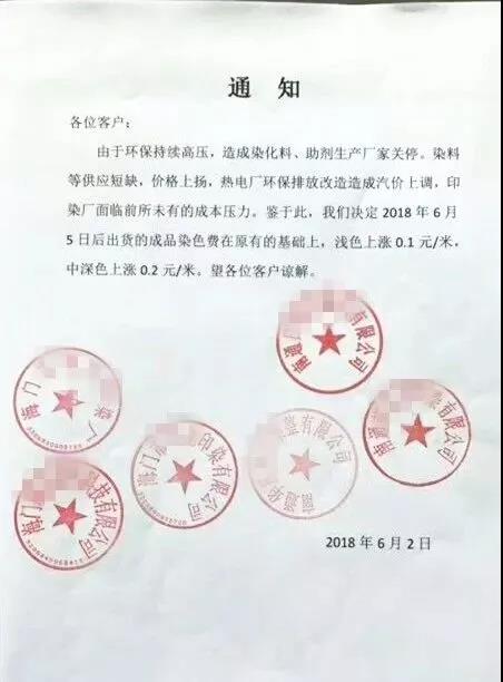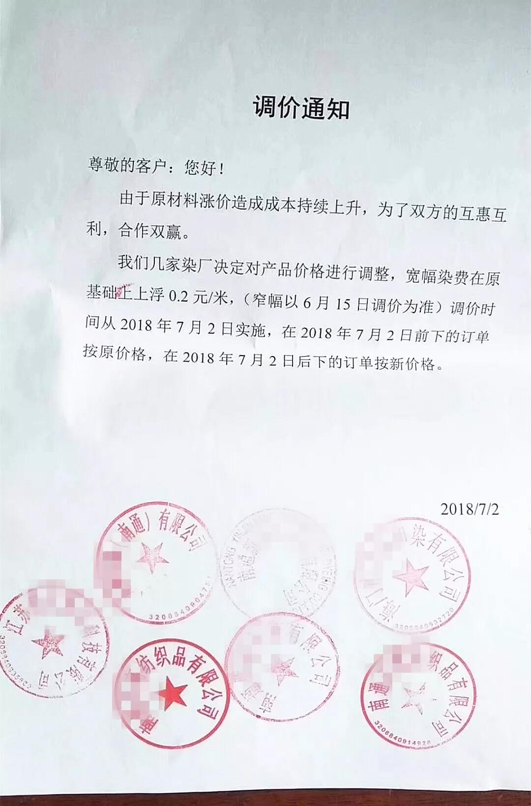 7月2日,南通8家印染企业齐发涨价通知,染费上调0.2元/米!