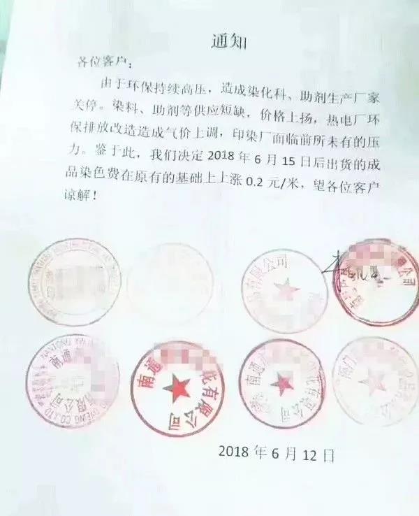 6月12日,南通8家印染企业齐发涨价通知,染费上调0.2元/米!
