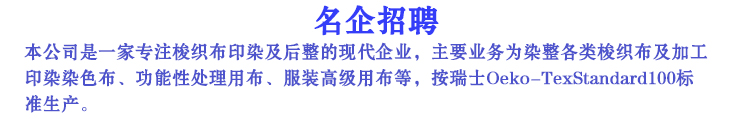 数码打样员:3名 男女不限,化工或染整专业中专以上学历,对颜色敏感,会PS或CAD,有印染厂调色、打板或对色相关工作经验优先,优秀的应届生亦可。(5000-7500元)