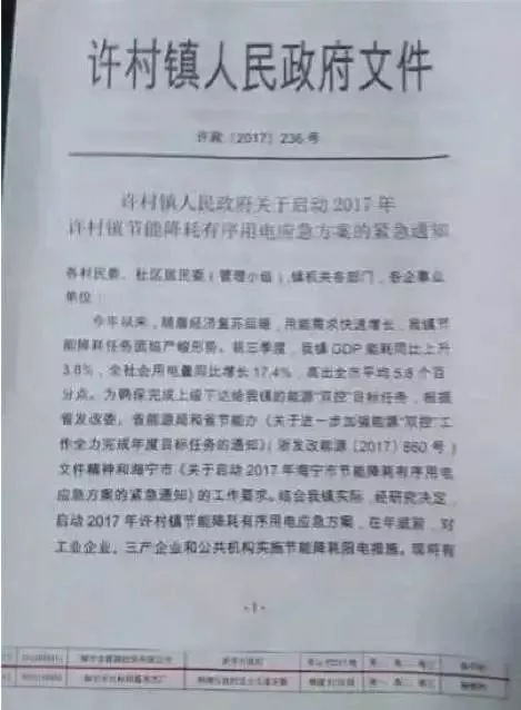 纺织重镇许村镇也发出两张限电通知:自11月16日起至12月底,规下企业每星期三、四、五停电24小时,即“开四停三”。