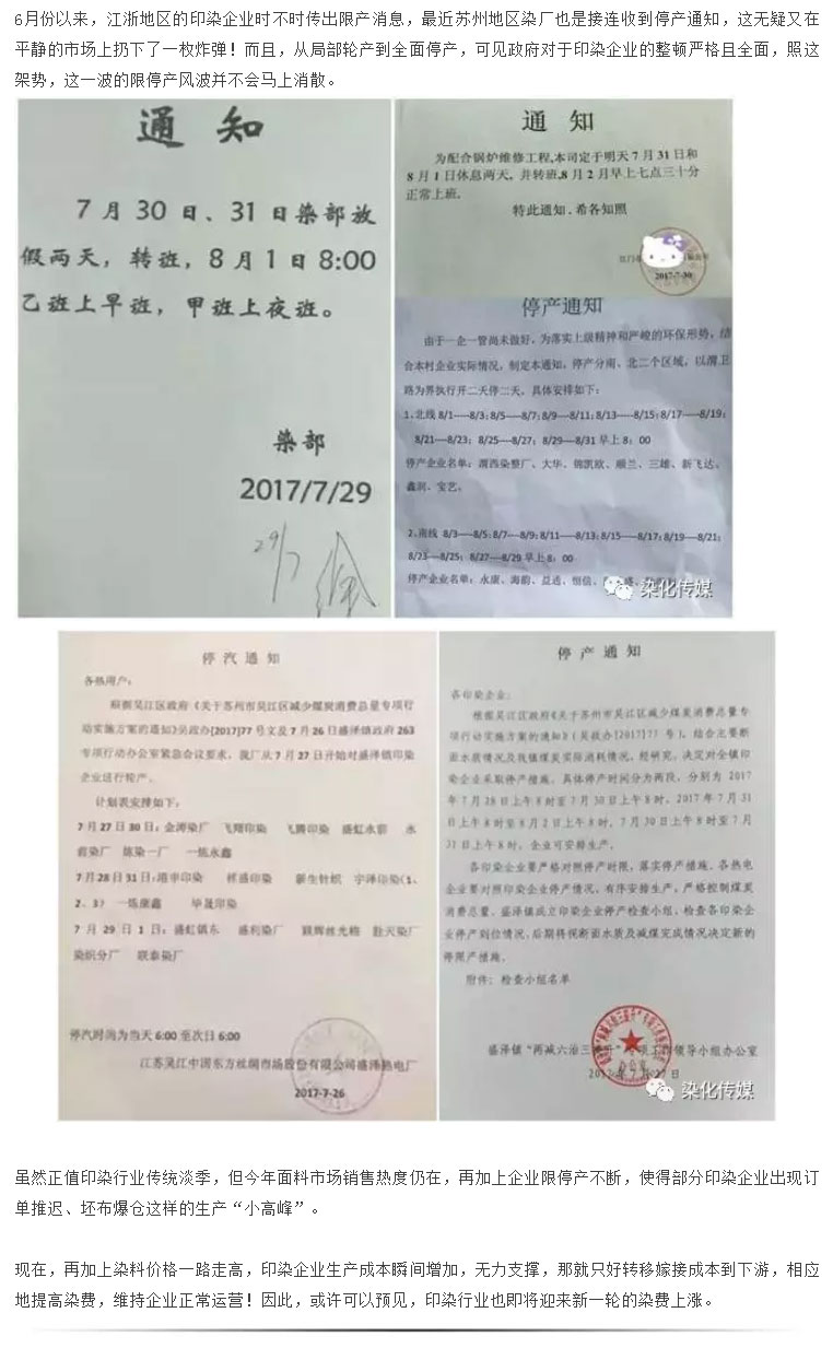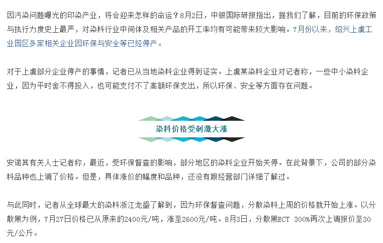 短短一周染料价格已大涨两次,染费上涨一触即发!环保风暴突袭“染料重镇”绍兴,部分企业被迫关停!