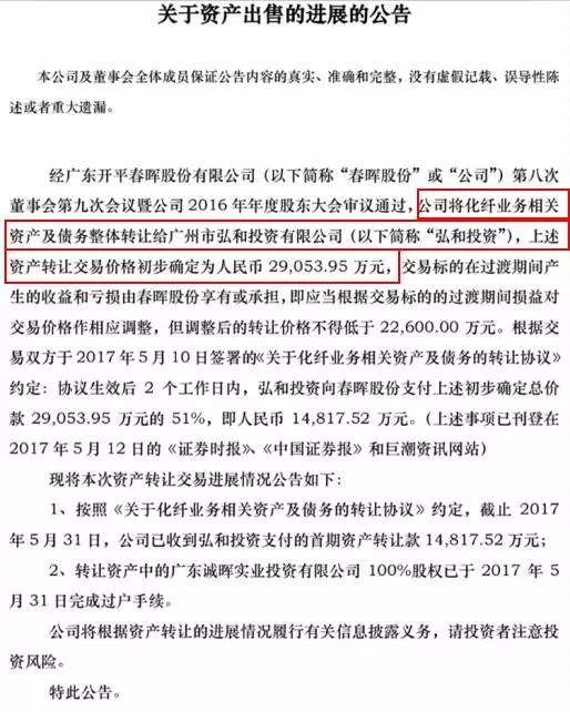 目前,弘和投资已经支付14817.52万元,转让资产中的广东诚晖实业投资有限公司100%股权也已经在5月底完成过户。此外,出售的化纤资产过户手续正在办理中,剩余尾款将根据合同规定支付。