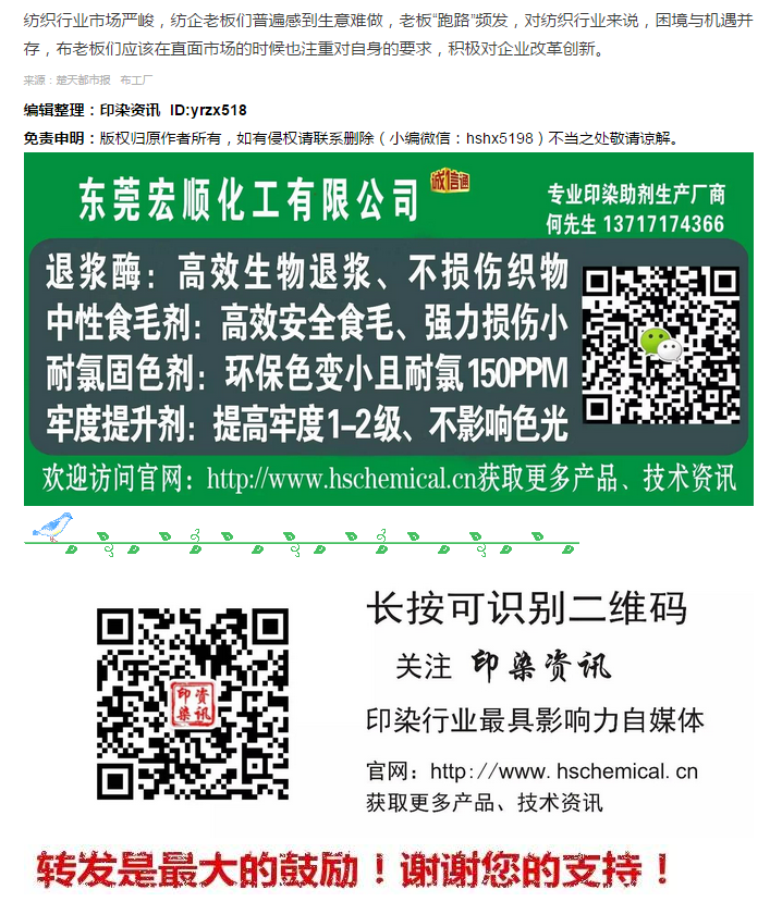 更多精彩内容,微信添加公众号:yrzx518或点击下方“印染资讯”长按二维码识别即可关注它!