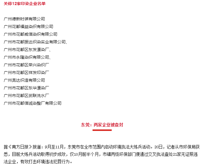 核心提示:就在河北保定市对高阳全县75家染厂限产停产整治的同时,远在南方的广东也在进行环保大整治行动。近日,汕头,肇庆,广州,东莞等地印染企业违规排污现象严重,各地政府部门联合执法,对印染行业进行环保大练兵!