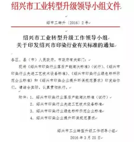 今年1月份绍兴柯桥区、袍江区分别采取“亮剑”行动后,绍兴市政府委托东华大学组织力量编制了《绍兴市印染行业落后产能淘汰标准》(试行)等四个标准,并于今年3月25日以“绍市工转升[2016]2号”文件下发。