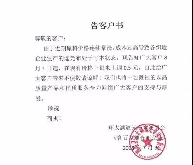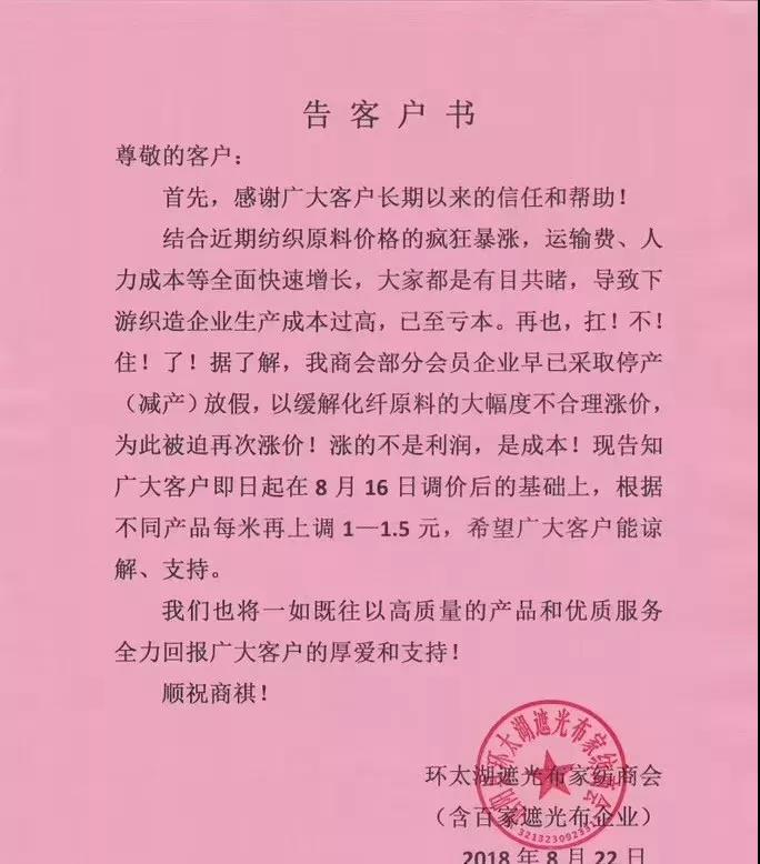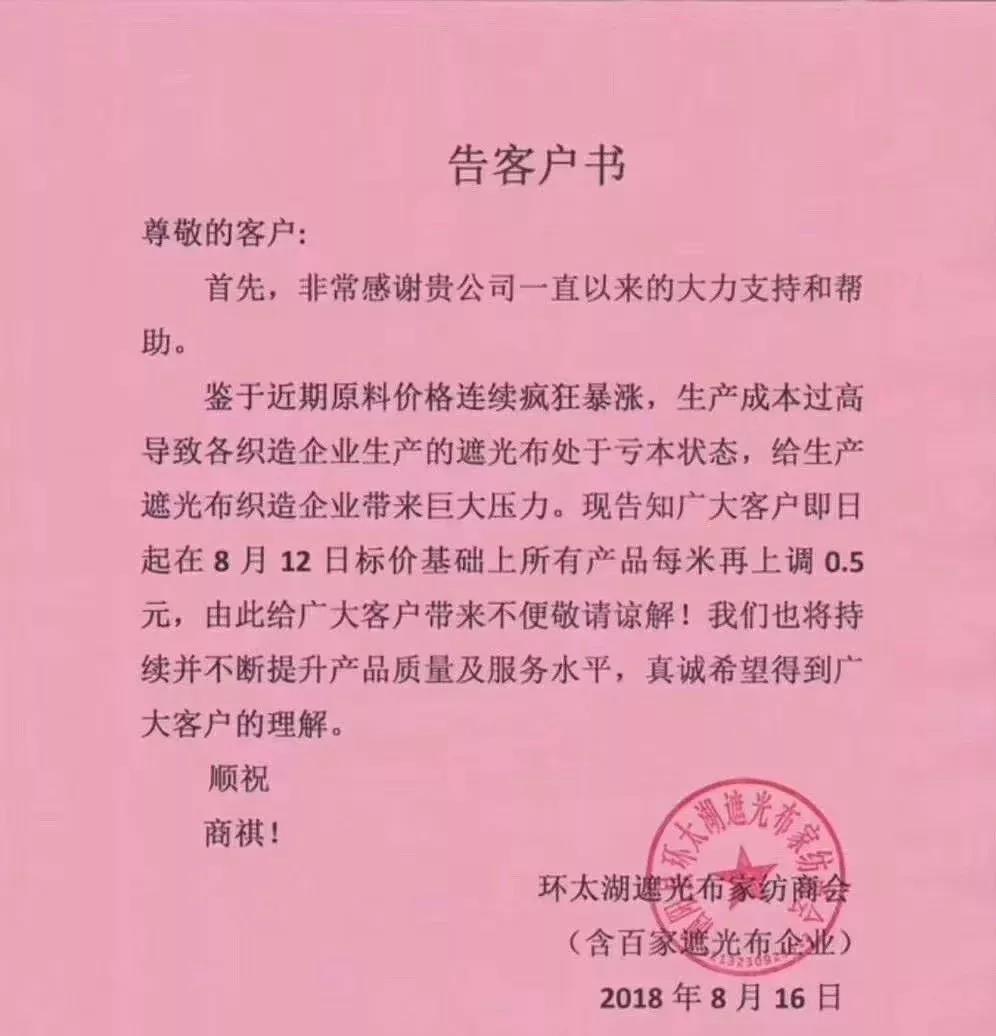 还记得,遮光布企业的一个月三连涨的通知嘛?