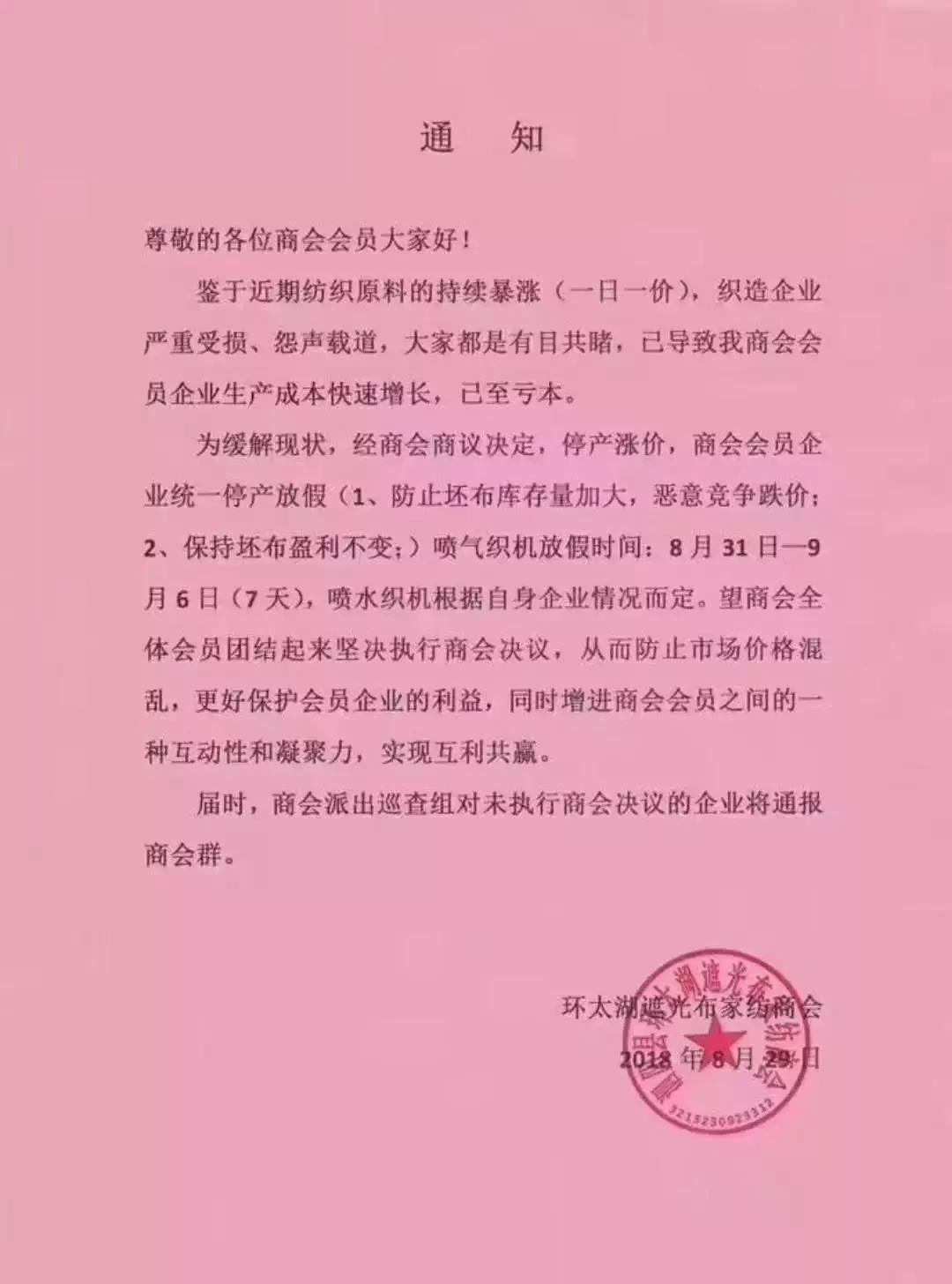 鉴于近期纺织原料的持续暴涨(一日一价),织造企业怨声载道,为了缓解现状,经环太湖遮光布企业商会商议决定喷气织机于8月31-9月6日(7天)停产放假。