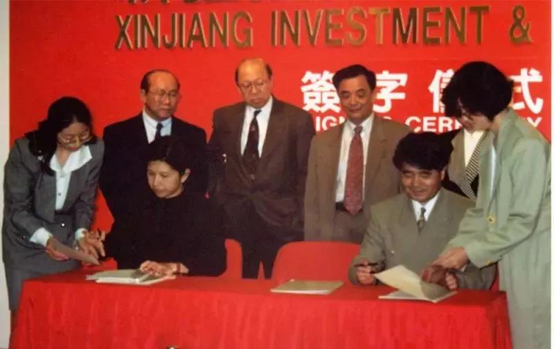 图:1995年,溢达集团杨敏德(前排左)和新疆自治区计委主任在吐鲁番地区行政公署礼堂共同签订《关於溢达集团在新疆吐鲁番独资兴建棉纺厂的确认书》/相片由受访者提供
