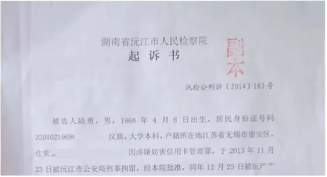 2014年7月,陆勇被沅江市人民检察院起诉,案由为“妨害信用卡管理”和“销售假药罪”,随后被取保候审。