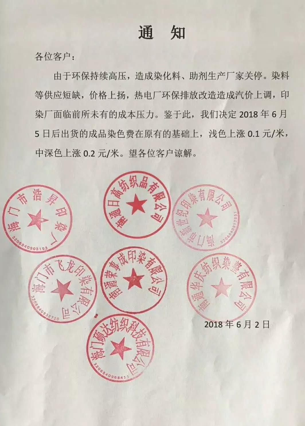 为进一步缓解各会员企业的生产成本压力,印染商会在广泛听取多方意见后,建议各会员企业根据自身实际情况,自2018年7月1日起上调印染加工费,建议上调幅度控制在500元/吨-1000元/吨之间。