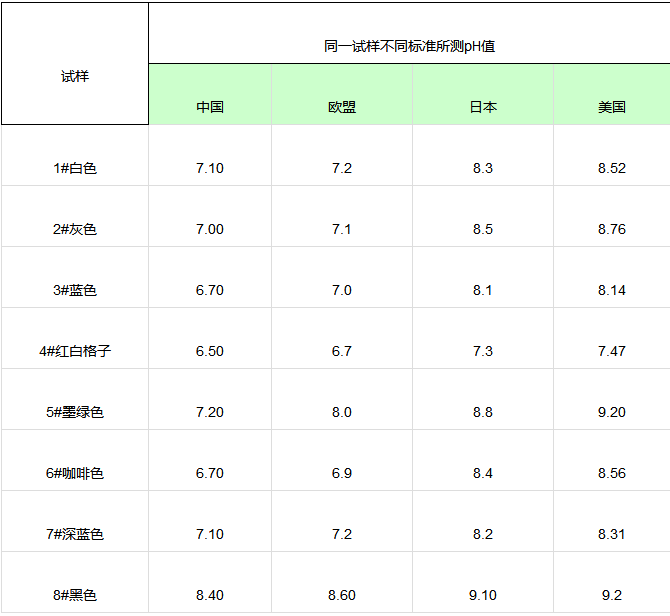 pH值即酸碱度,人体皮肤呈弱酸性,在这种环境条件下可以防止病菌的侵入,因此纺织品的pH值若在微酸或者中性之间就有利于保护人体健康;反之,纺织品pH值过高或过低都会破坏皮肤的平衡和抵抗能力,从而引起皮肤过敏或者诱发感染导致病菌侵入。
