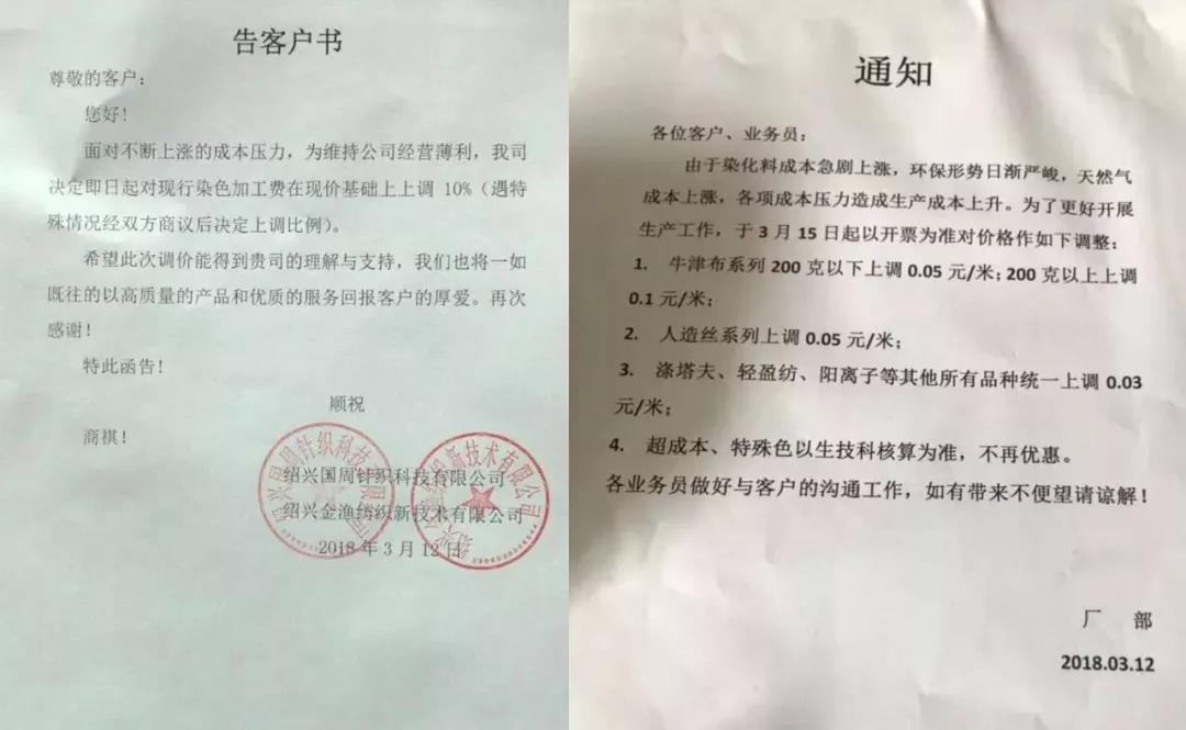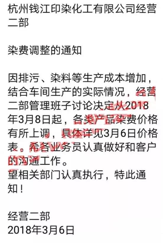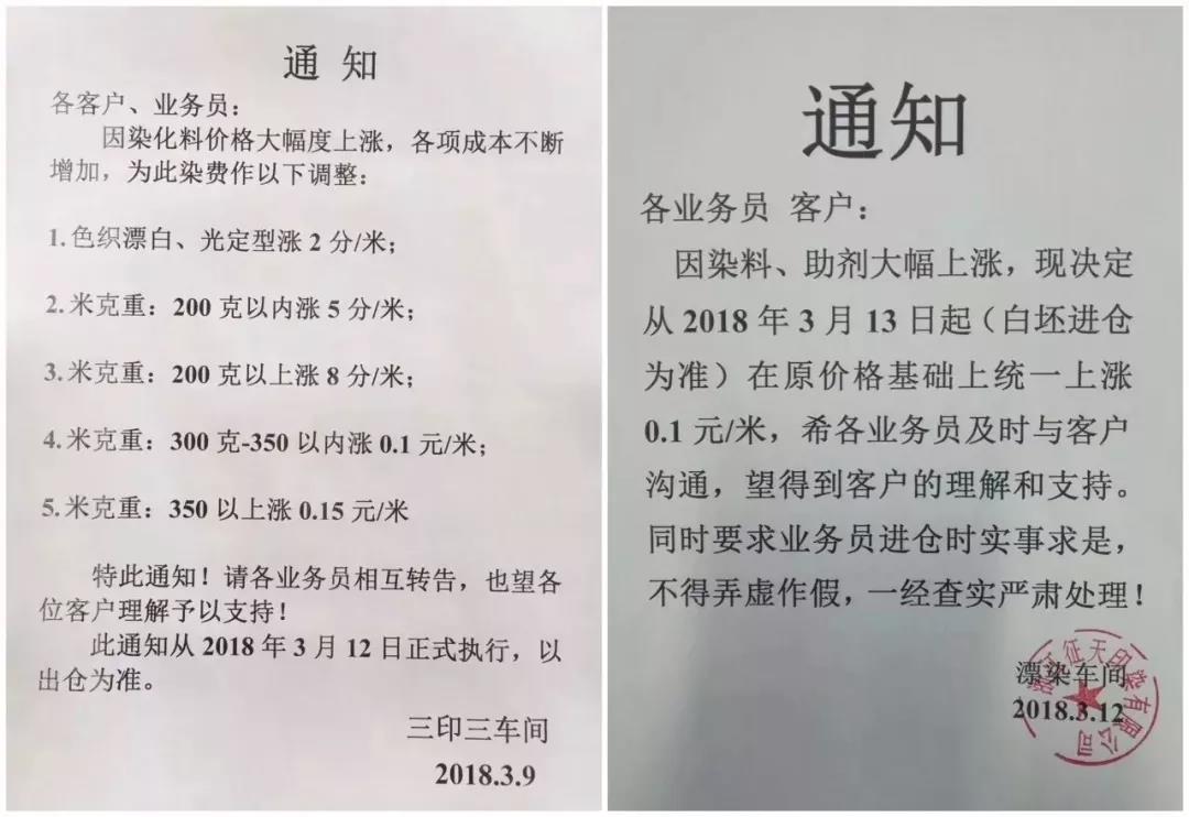 如2018年2月底,福建长乐等地区印染企业打响染费涨价第一炮。调价函称,此次染费上涨的主要是基于近期染料、煤炭、工人工资等成本急剧上升的原因,企业负担过重,不得不涨价。2018年3月初,南通地区11家印染企业统一发布提价函称,企业的生存环境和生产空间受到了前所未有的挑战,并在此节点上上调加工费用。