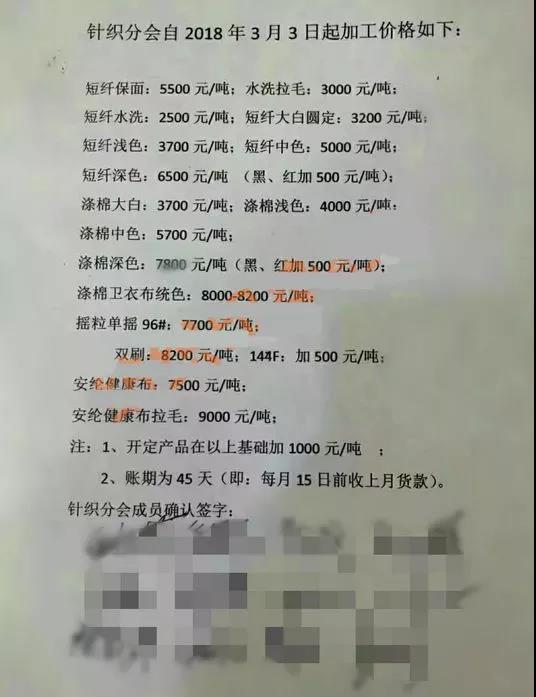 针织分会自2018年3月3日起加工价格如下: