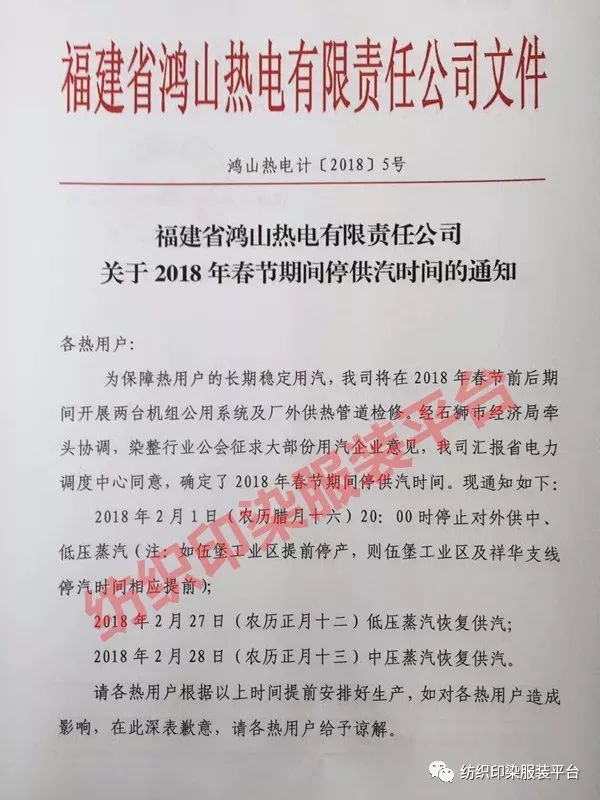 石狮鸿山热电厂停汽时间公布,意味着石狮印染行业放假时间基本确定,因石狮印染行业已经基本上都用热电厂的中低压蒸汽。