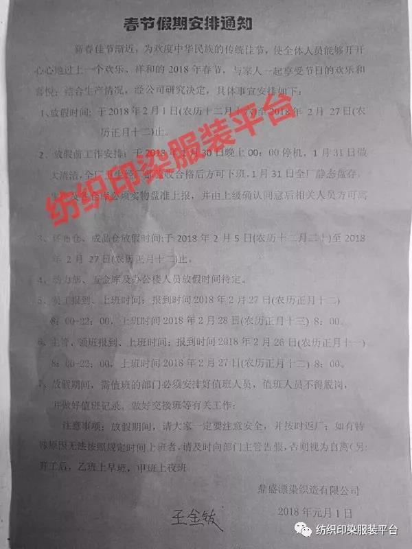 石狮大堡工业区印染厂放假通知