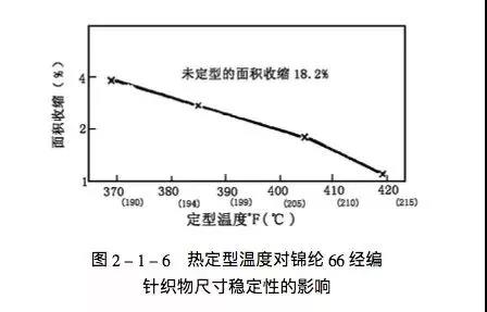 锦纶织物的情况也相类似,将具有4%正常回潮率的锦纶66经编针织物,经不同温度热定型后,再在1克/升的皂液中于200°F处(93.3℃)时处理1小时,它们的面积收缩百分率如图2-1-6所示。