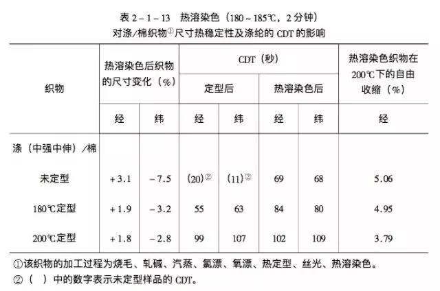 对于需要在一般导辊式热溶染色机上进行热溶染色的织物,则染前热定型的工艺条件,应随热溶染色的具体条件而作适当的调整,现将未定型与经180℃和200℃定型后涤/棉织物,在热溶染色时经、纬向的尺寸变化率与涤纶的临界溶解时间(简称CDT)列于表2-1-13中。