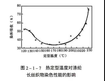 从图2-1-7可以看出,随着定型温度的升高,织物对染料的吸收不断降低,当定型温度为时,对染料的吸收降到最低值,超过180℃后重又上升,甚至超过未定型的织物。