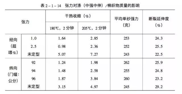 因此,为了使织物获得良好的尺寸热稳定性和有利于提高织物的服用性能,热定型时经向应有适当超喂,纬向伸幅不应太高。