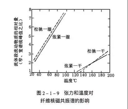 图2-1-9较锦纶6在干热和润湿状态下,热定型后纤维的核磁共振试验结果,已经知道核磁共振试验可以检出纤维中流体般运动的大分子链段的含量。