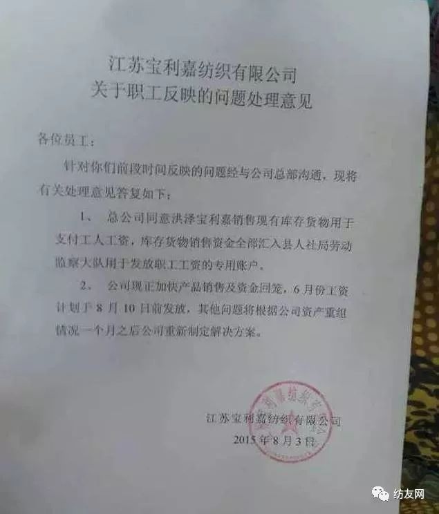 2015年7月31日,据安徽经视频道《第一时间》栏目报道,安徽六安宝利嘉纺织工厂门遭上百工人围堵讨薪,据报道称该工厂已与25号停产放假,共拖欠上千员工2个月一千多万工资。随即该公司员工爆料,宝利嘉集团位于江苏洪泽、安徽六安、滁州的3个生产基地与7月25号同一天停工,老板欠下了3.5个亿已"跑路"。