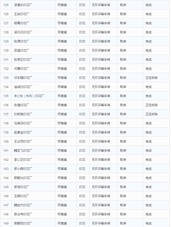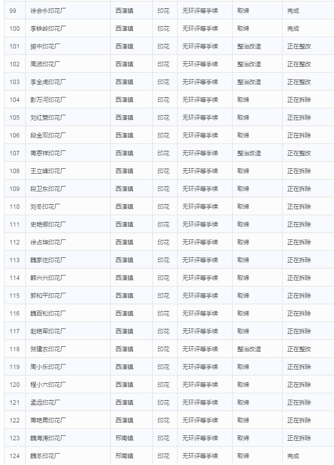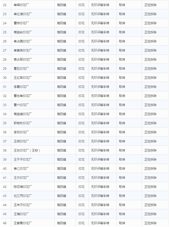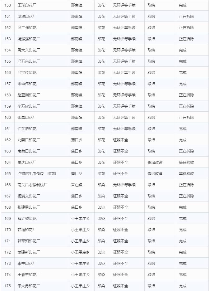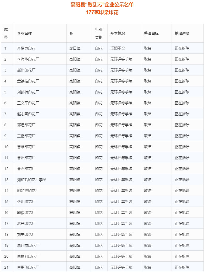 177家印染印花厂被取缔:河北高阳县是中国毛巾毛毯名城,1997年就被河北省政府命名为纺织强县,有中国最大毛巾专业市场——高阳县纺织商贸城,高阳县纺织博物馆是中国唯一的县级专业纺织博物馆。