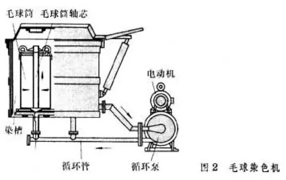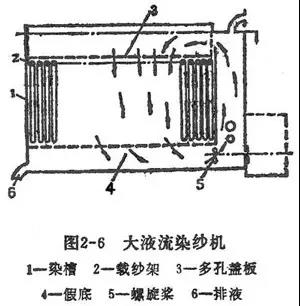 经纱卷绕在中空且表面布满小孔的卷轴上,放在圆筒形机体的中央,染液由泵自内向外或自外向内循环。