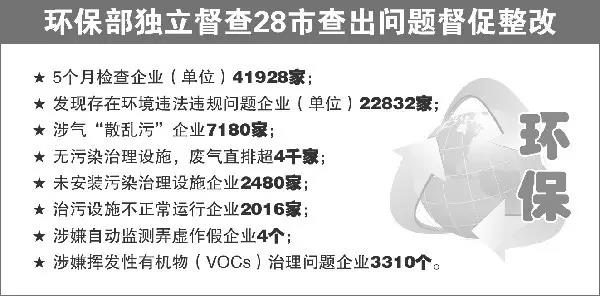 4月7日至8月31日,环保部派出的大气污染防治强化督查28个督查组已完成十轮次督查。环保部透露,过半数的问题企业中,涉气“散乱污”问题企业7180家,超标排放的67个,未安装污染治理设施的2480个,治污设施不正常运行的2016个,涉嫌自动监测弄虚作假的4个,挥发性有机物(VOCs)治理问题的3310个。